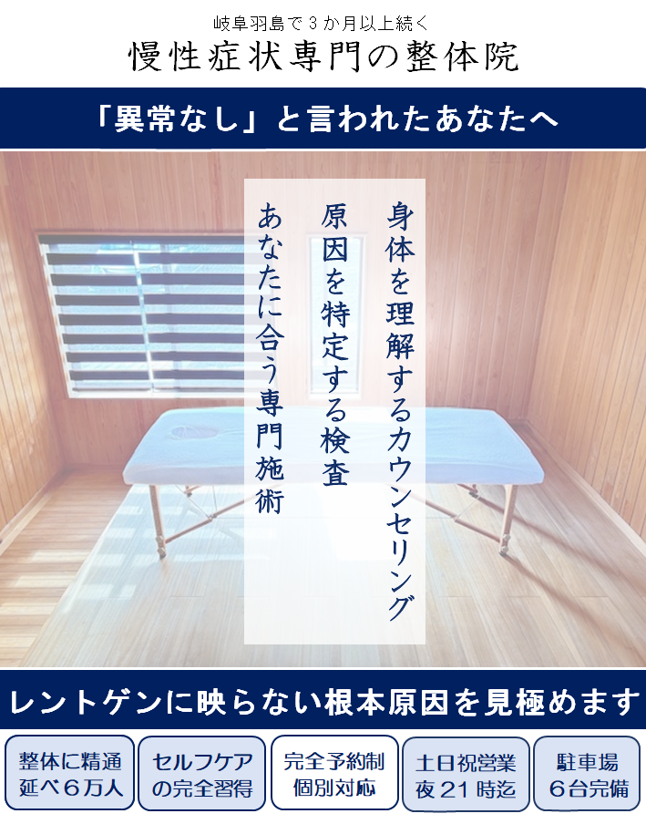 レントゲン・MRIで異常がないと言われた方ほど、隠れた原因が見つかることがあります。「なぜ痛むのか」を明確にできることが、改善への最短ルートです。