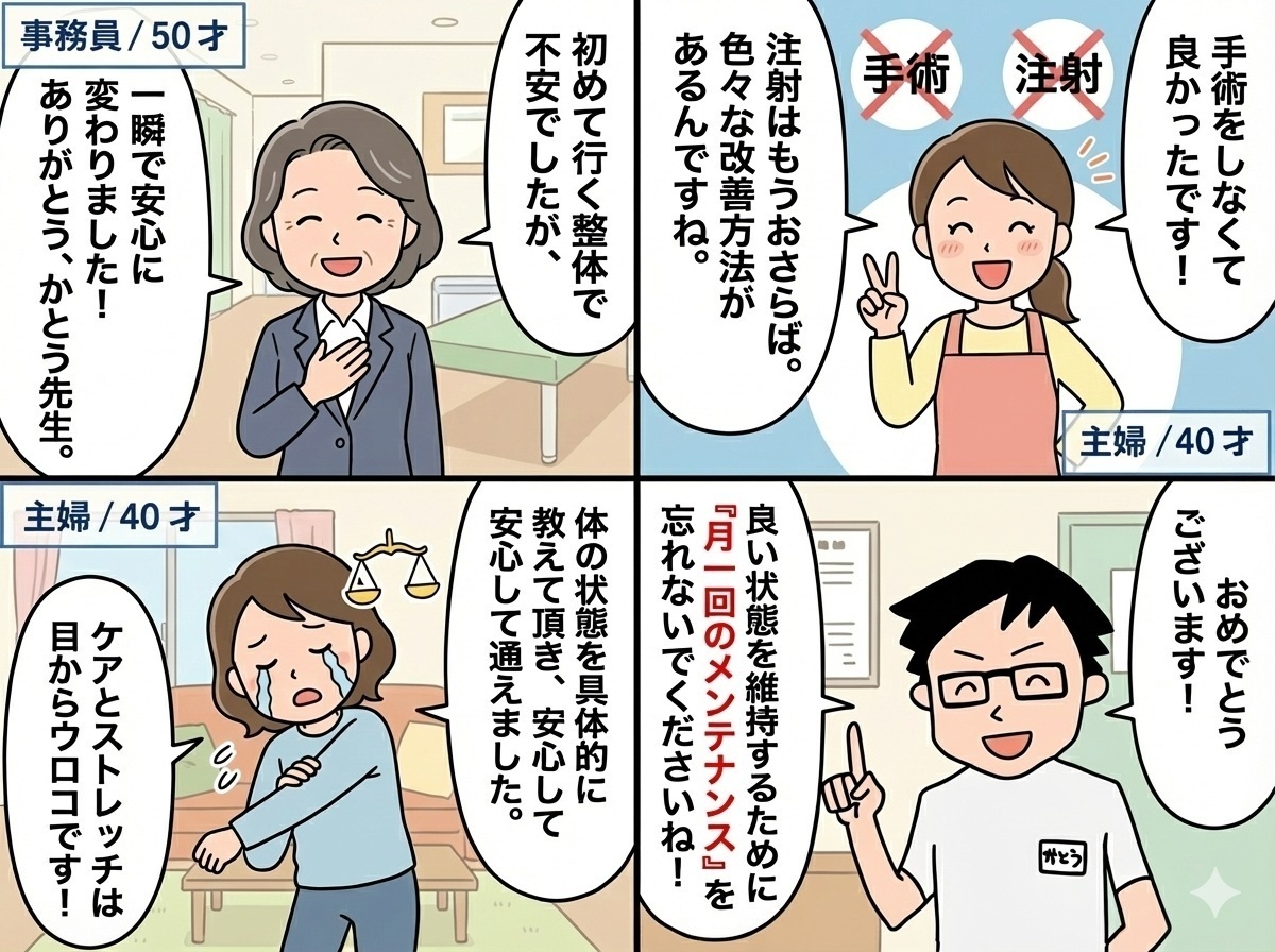 最初の施術が終わって何も変化がないように思えて、本当に大丈夫かな?と疑問に思っていたけど、何回も通っていくうちに、だんだんと膝の痛みもやわらいで運動してもあまり気にならないくらいまでになりました。
