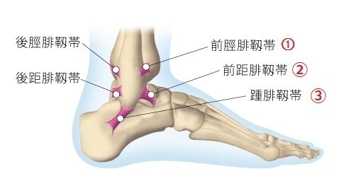 足首を捻ると、図➀②③の靱帯が損傷するケースが多々あります。