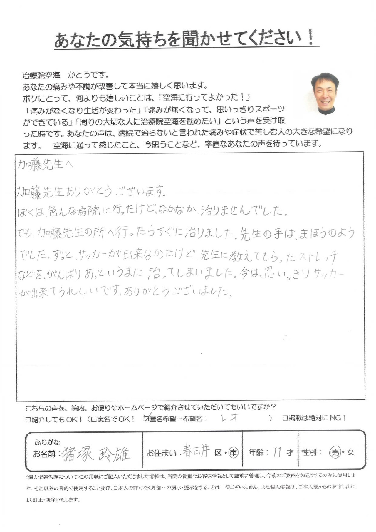 空海にいって、とってもよかったです!! いたみがなくなり思いっきりサッカーができるようになりました。