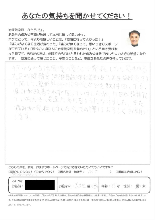 4月からの生活環境の変化から発症したと思われる右足の腱鞘炎【足底筋膜炎、単腓骨筋腱付着部炎?】に関して、整形外科や接骨院などを数件回っても、痛みが改善されず困っていましたが、何回か施術していただき、普通に歩けるようになりました。