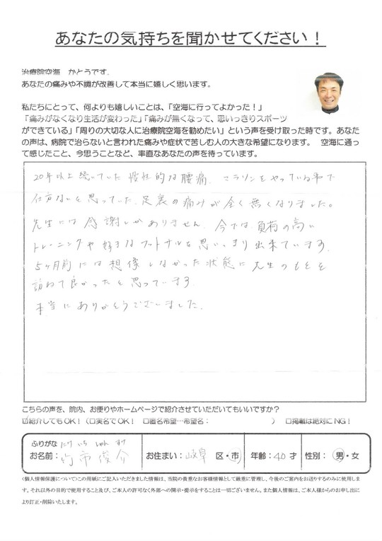 20年以上続いていた慢性的な腰痛、マラソンをやっていることで仕方ないと思っていた足裏の痛み(足底筋膜炎)が全くなくなりました。