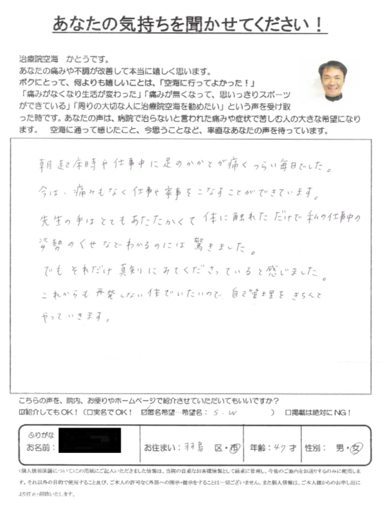 SWさん、かかとの痛みが解消して良かったですね。セルフケアは毎日の習慣にして下さいね。治療院空海を選んで頂き感謝致します。 【かとう】