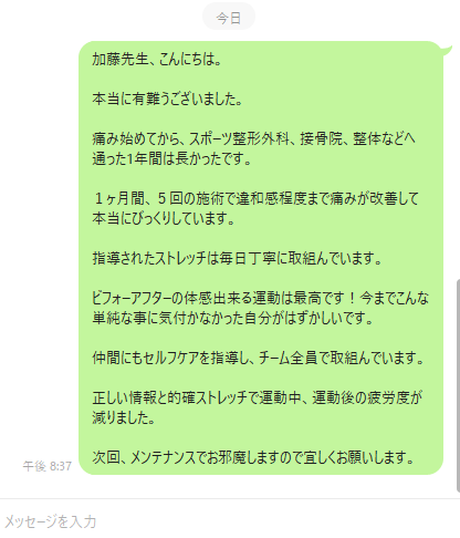 痛み始めてから、スポーツ整形外科、接骨院、整体などへ通った1年間は長かったです。