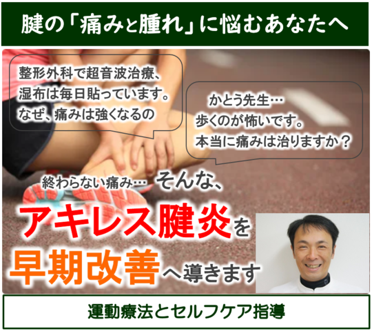 アキレス腱炎は患部の検査(レントゲン、エコー、MRI)では原因の理解が困難で、マッサージ、電気、アイシングなど、対処法(部分的な処置)での改善は難しい疾患です。