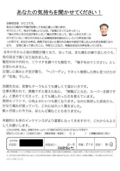 1年以上前から指の痛みに悩んで整形外科で痛み止めの薬をもらっていましたが何の変化もなく、不安な毎日でした。