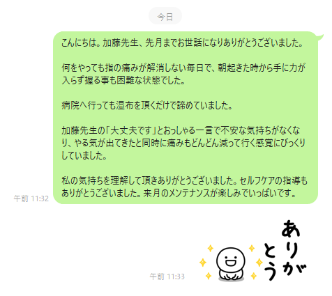 その後2、3回と施術を続けていくうちに施術後の痛みもほとんど感じられなくなりました。さすが、かとう先生と思っていました。