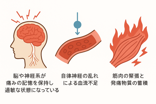 脳が間違った痛み信号を送り続け、血流不足で炎症が長引きます。
