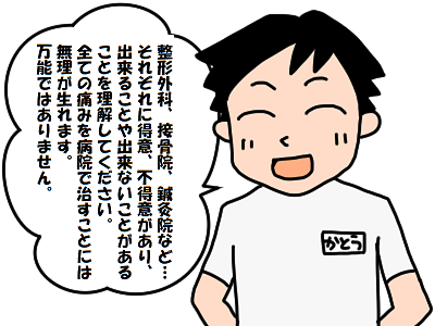 整形外科、接骨院、鍼灸院、カイロ、整体院などそれぞれの特徴や得意とする症状、治療方法を使い分けることが大切です。