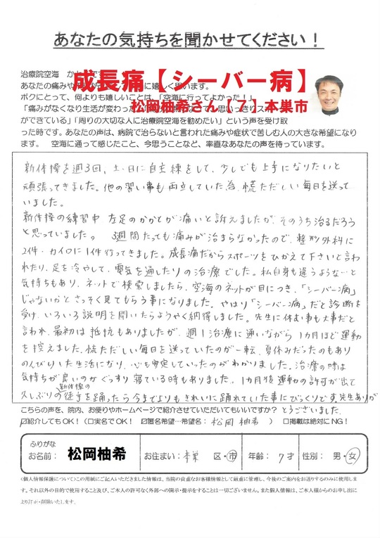 まずは、孝雄くんの気持ちをリラックスさせ二人三脚でシーバー病治療へ進みます。