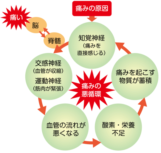 慢性期は身体全体が痛みの悪循環に陥ります。ですから、悪循環を断ち切る事が大切です。難治性疾患と言われるのは、このような事が理由の一つです。