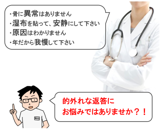 生活習慣や歩行の癖、身体全体のバランス、心理に関連する原因が多いため、病院や接骨院のレントゲン検査、湿布、電気、注射では原因の見極めが出来ない。一時的な痛みの緩和治療に終始するため治療に行き詰まりを起こります。