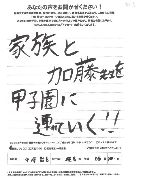 半信半疑でしたがかとう先生にお会いし、先生の人柄、自己治癒力を大切にされる施術法、”絶対治るという信念をもつ”という励まし等々、どれほど私を安心させ勇気づけてくださったことか…