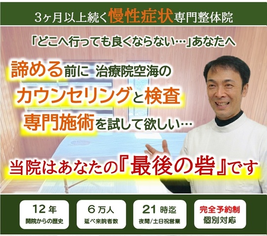 治療院空海では2014年の開院以来、延べ6万人の慢性症状の方々と向き合ってきました。