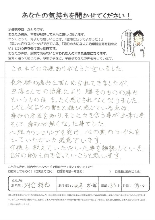 長年腰の痛みに苦しめられてきましたが、空海さんでの施術により、腰そのものの痛みというものは、まったく感じられなくなりました。しかし、何よりも驚きと嬉しく感じている点は、痛みの原因を知りそこに向き合う事が出来た事、そして痛みが無くなった事でした。