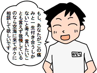 学校の先生やコーチに「痛みと付き合っていくしかない」と言われて、がっくりきていた時に、インターネットで空海の事を知りました。