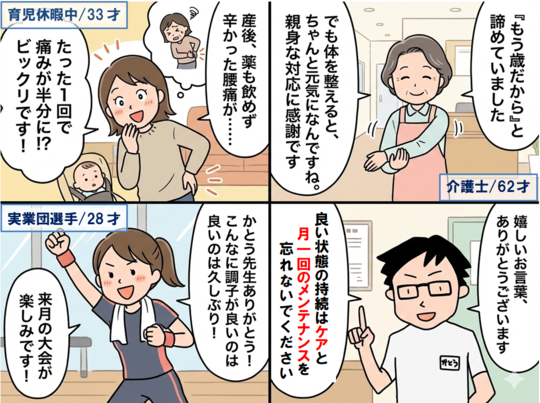 最初の施術が終わって何も変化がないように思えて、本当に大丈夫かな?と疑問に思っていたけど、何回も通っていくうちに、だんだんと膝の痛みもやわらいで運動してもあまり気にならないくらいまでになりました。