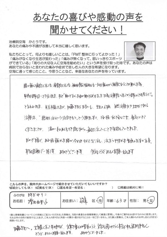 おかげ様であれ程痛かった膝の痛みは今では98㌫改善し、回復したらやりたかった普通の生活が出来、本当に感謝で一杯です。ありがとうございます。